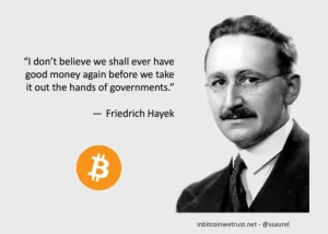 A Bitcoin a szabad piac terméke. Senki nem rendelte meg, nem tervezte meg központilag, hanem Satoshi Nakamoto önkéntesen megosztotta a világgal, és az emberek szabadon döntenek, hogy használják-e. Nem kell engedélyt kérni, hogy Bitcoin-t használj. Nincs CEO, nincs központi iroda, nincs ügyfélszolgálat, amely eldöntené, ki használhatja. Ez a pénzpiac szabad választása: aki értéket lát benne, az használja, aki nem, az nem. Pontosan úgy, ahogy Hayek már 1976-ban elképzelte.